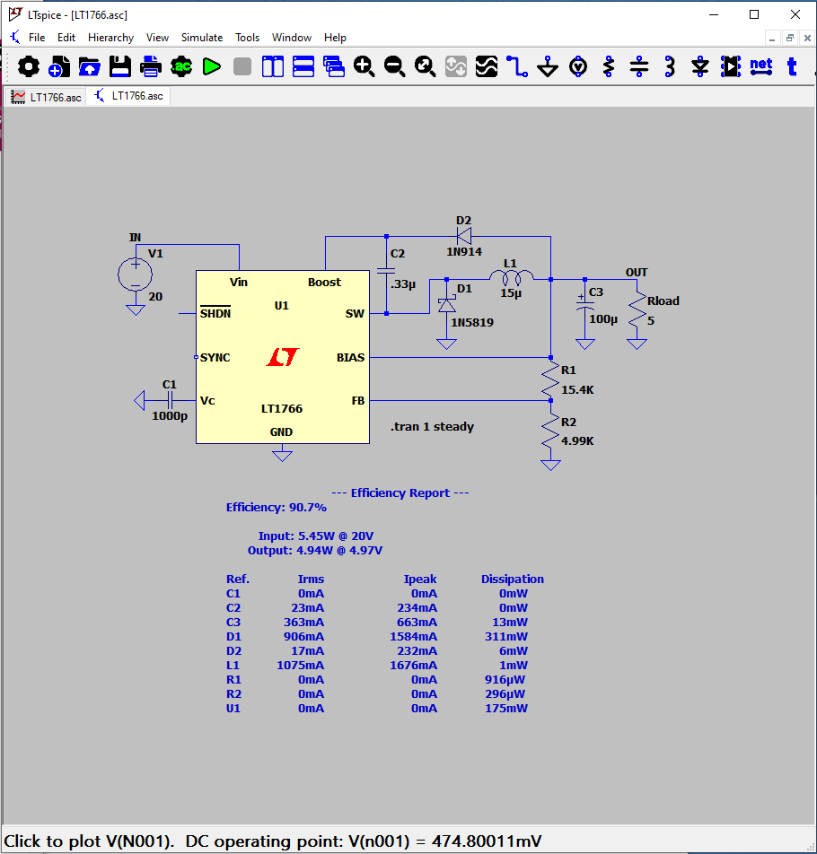 It is possible to obtain an efficiency report from a DC-DC converter from a time domain .tran analysis that contains the keyword "steady". After a steady state simulation, an efficiency report can be made visible on the schematic as a block of comment text: