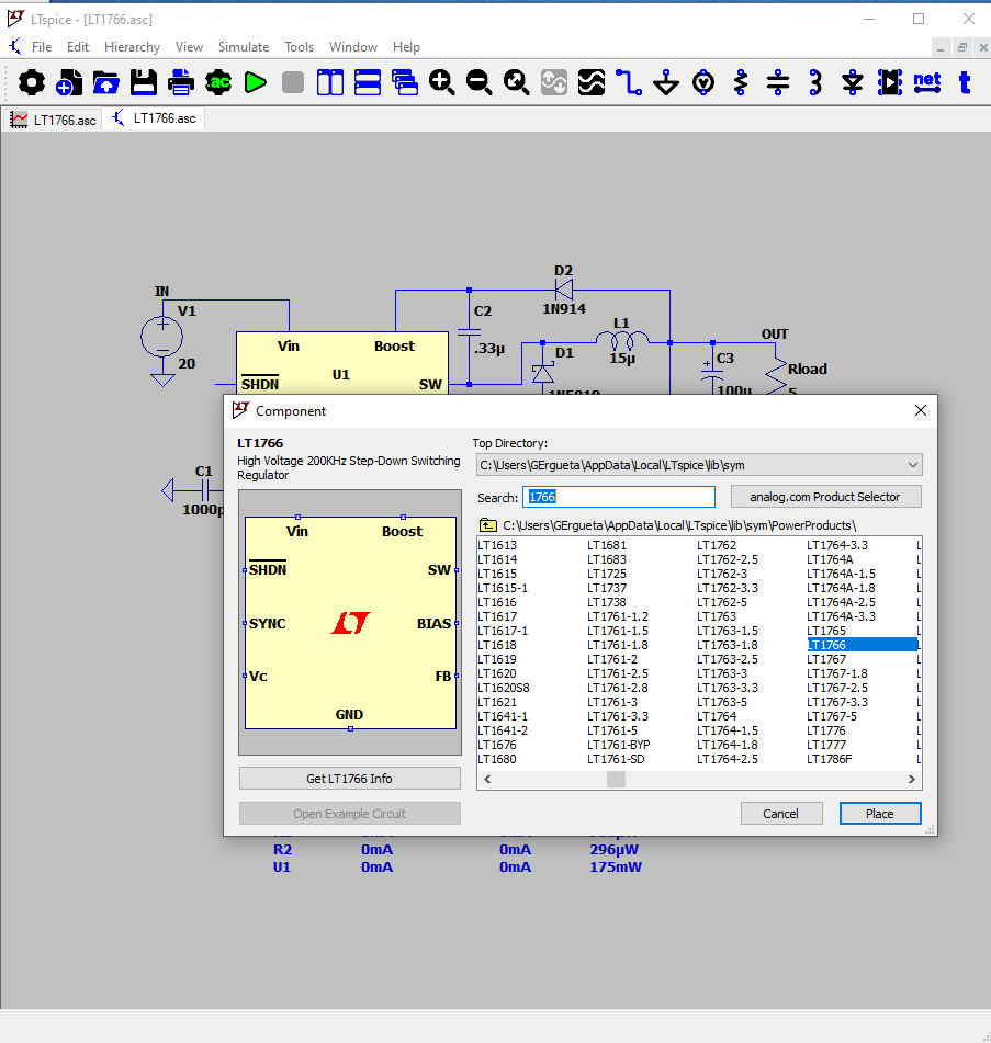 - There is a button to open an example circuit for the Analog Devices models, and there is button to