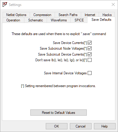 These settings are used when you don't explicitly state which nodes should be saved in a simulation. Useful settings are "Save Device Currents", "Save Subcircuit Node Voltages", and "Save Subcircuit Device Currents". Device voltages and internal device voltages are only of internal program development use.