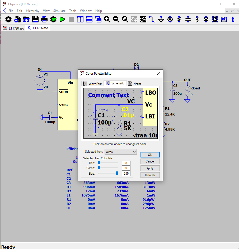 Menu command Tools > Color Preferences colors allows you to set the colors used in displaying the schematics. You click on an object in the sample schematic and use the red, green and blue sliders to adjust the colors to your preferences.