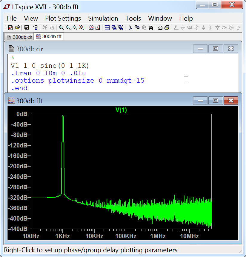 When you expect to do FFT's of your simulation data, you will probably want to turn off waveform compression, stipulate a maximum time step, and possibly even use double precision waveform file format to reduce the numeric noise floor. The following netlist shows that the intrinsic noise floor of LTspice's FFT algorithm is in excess of 300dB.