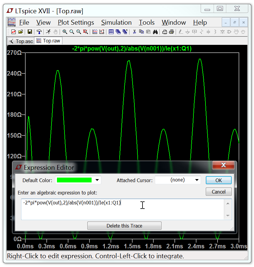Both the View > Visible Traces and View > Add Trace commands allow one to enter an expression of data. Another method to plot an expression of available simulation data traces is to move the mouse to the trace's label and right click. This dialog box also allows you to set the trace's color and allows you to attach a cursor to the waveform. LTspice will do a dimensional analysis of the expression and plot it against a vertical axis labeled with those units. For example, below you can see that LTspice identified the dimensions of -2*π*pow(V(out),2)/abs(V(n001))/Ie(x1:Q1) as Ω. All waveforms in a plotting pane with the same units are plotted on the same axis.